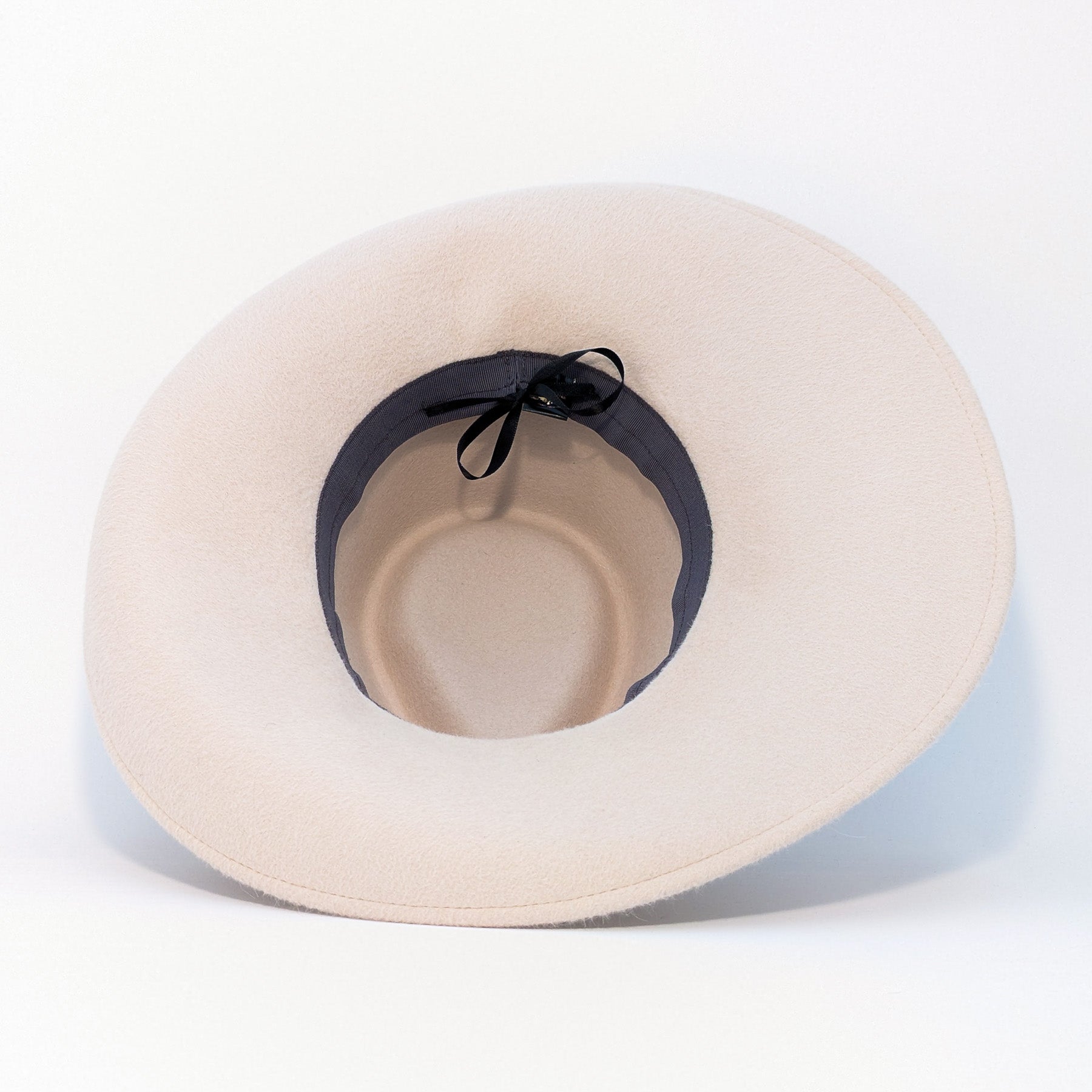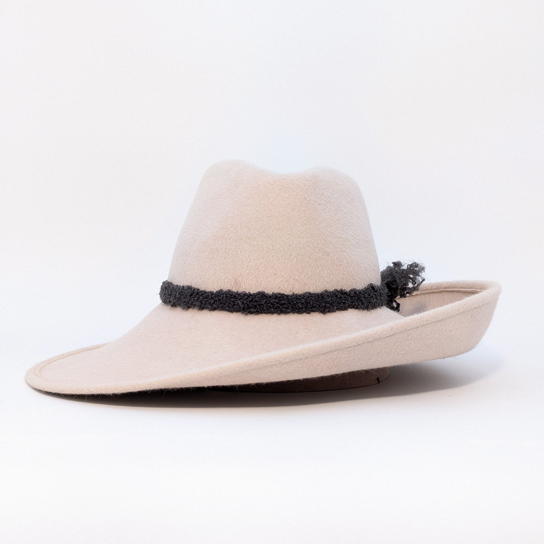 This long haired rabbit felt hat in bone features a pinched crown, an asymmetrical brim, and a grosgrain sweatband is decorated with a woven band for flourish.