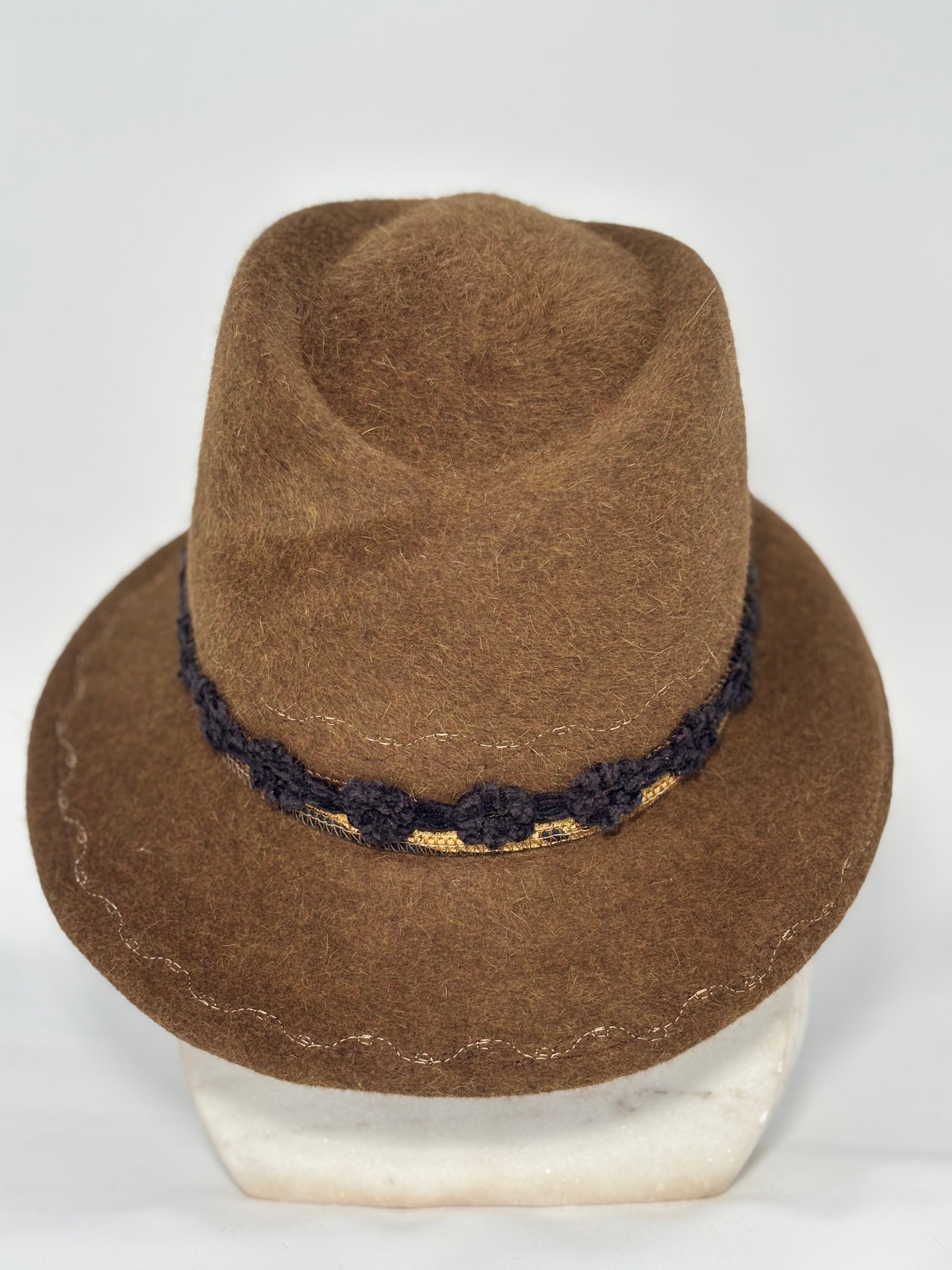 Finished with hand-sewn trim and an adjustable grosgrain interior.