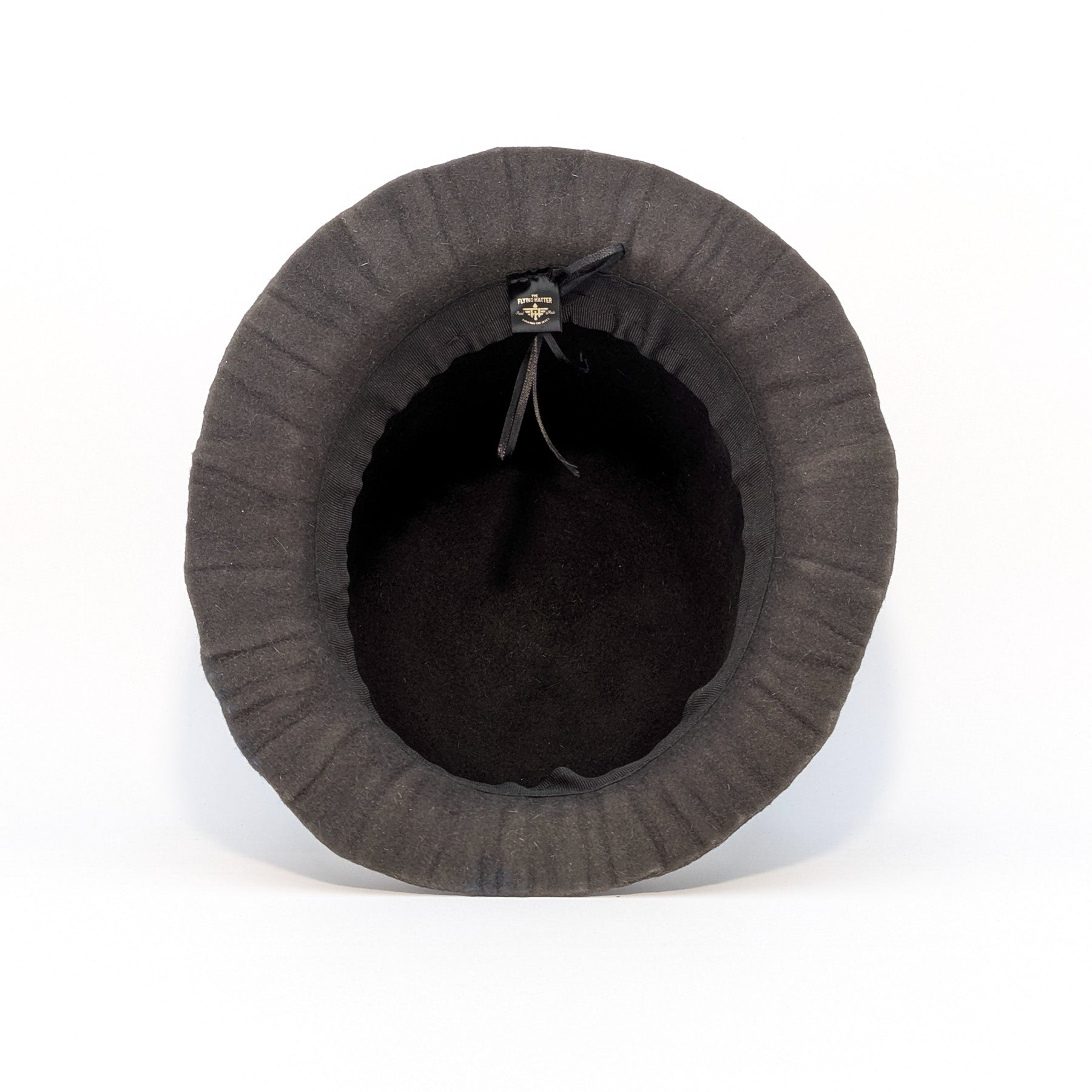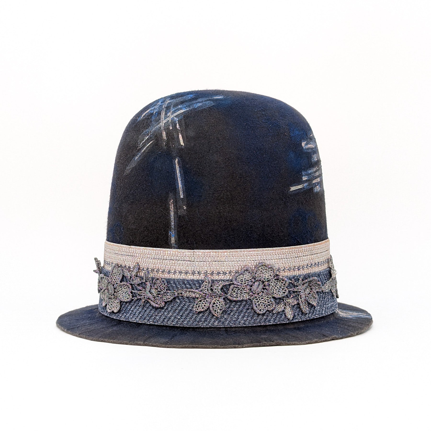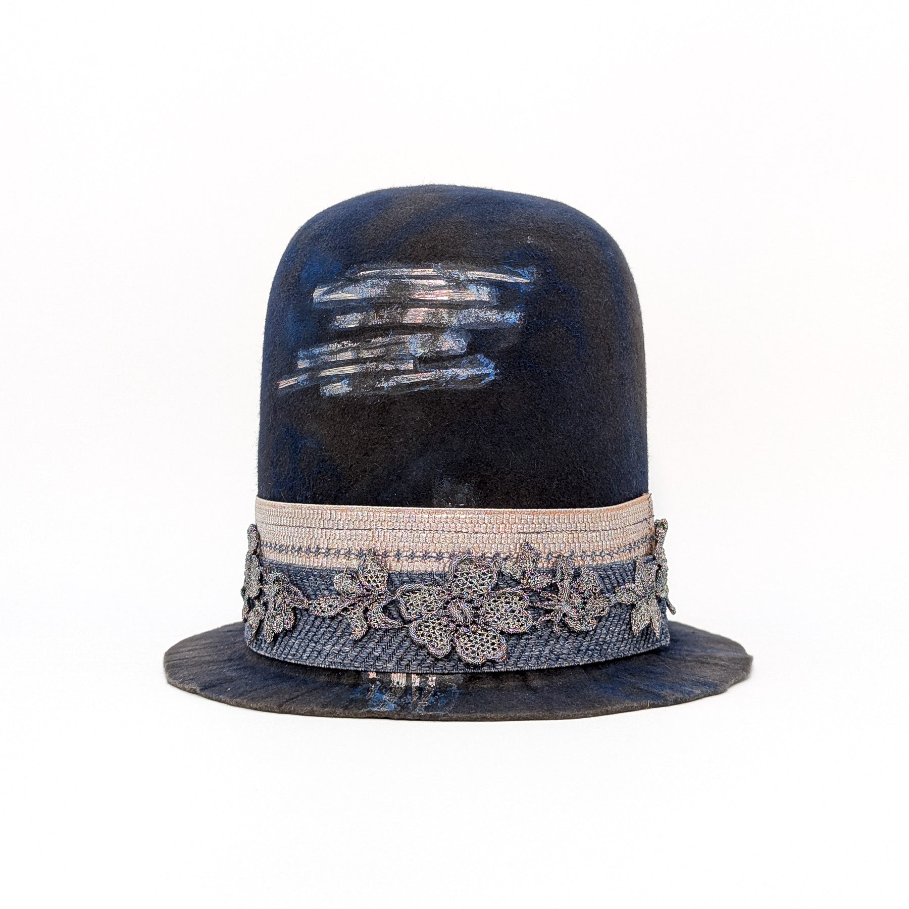 With a tall open crown this hat stands out with its blend of black and blue western weight felt with touches of abstract silver strokes and layers of elastic and embroidered bands. Featuring a grosgrain sweatband for an exact fit for a range of sizes.