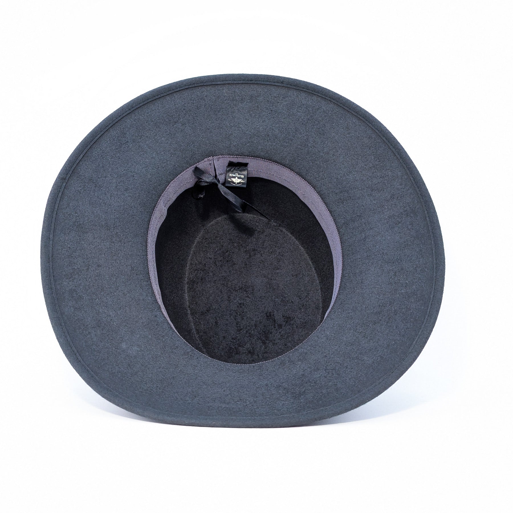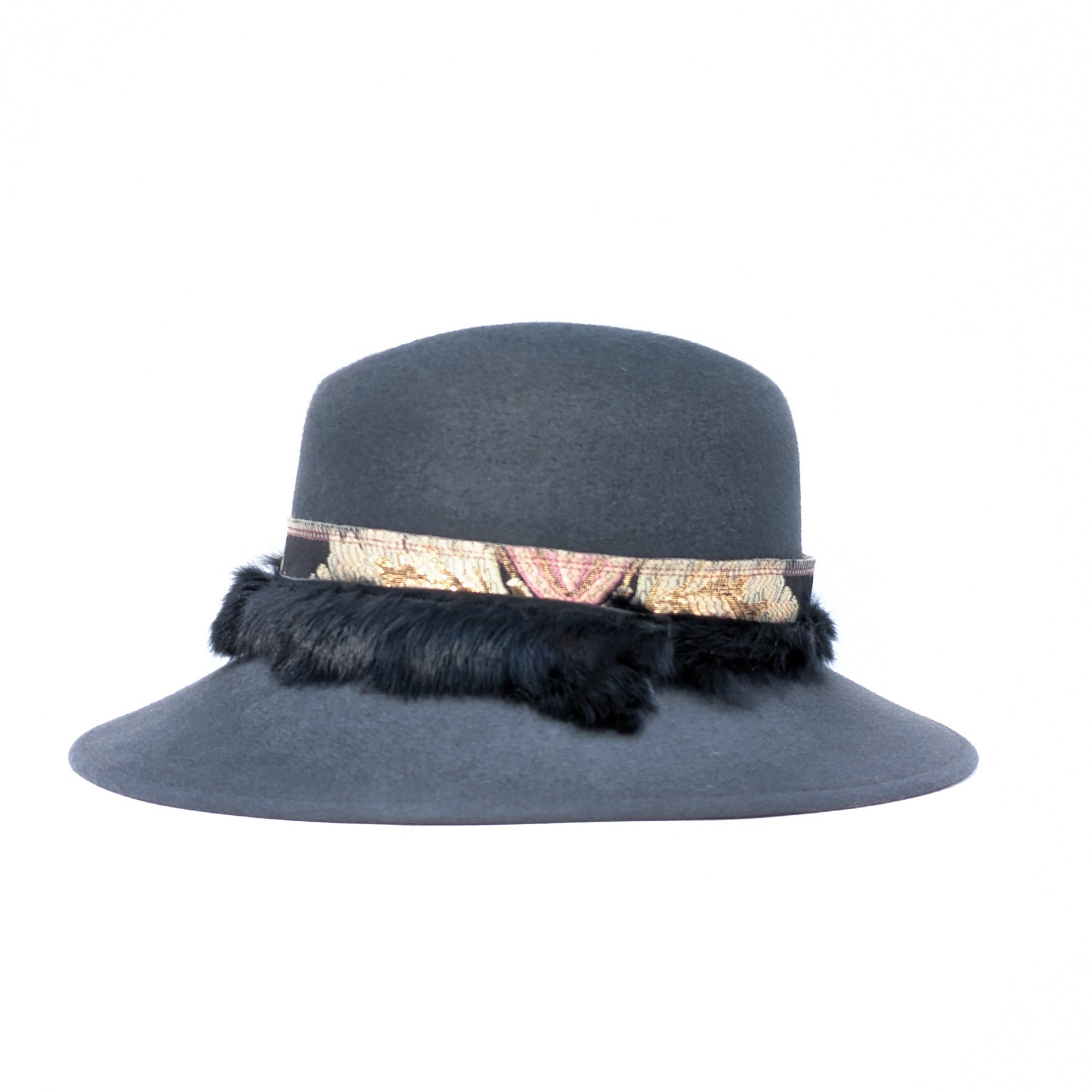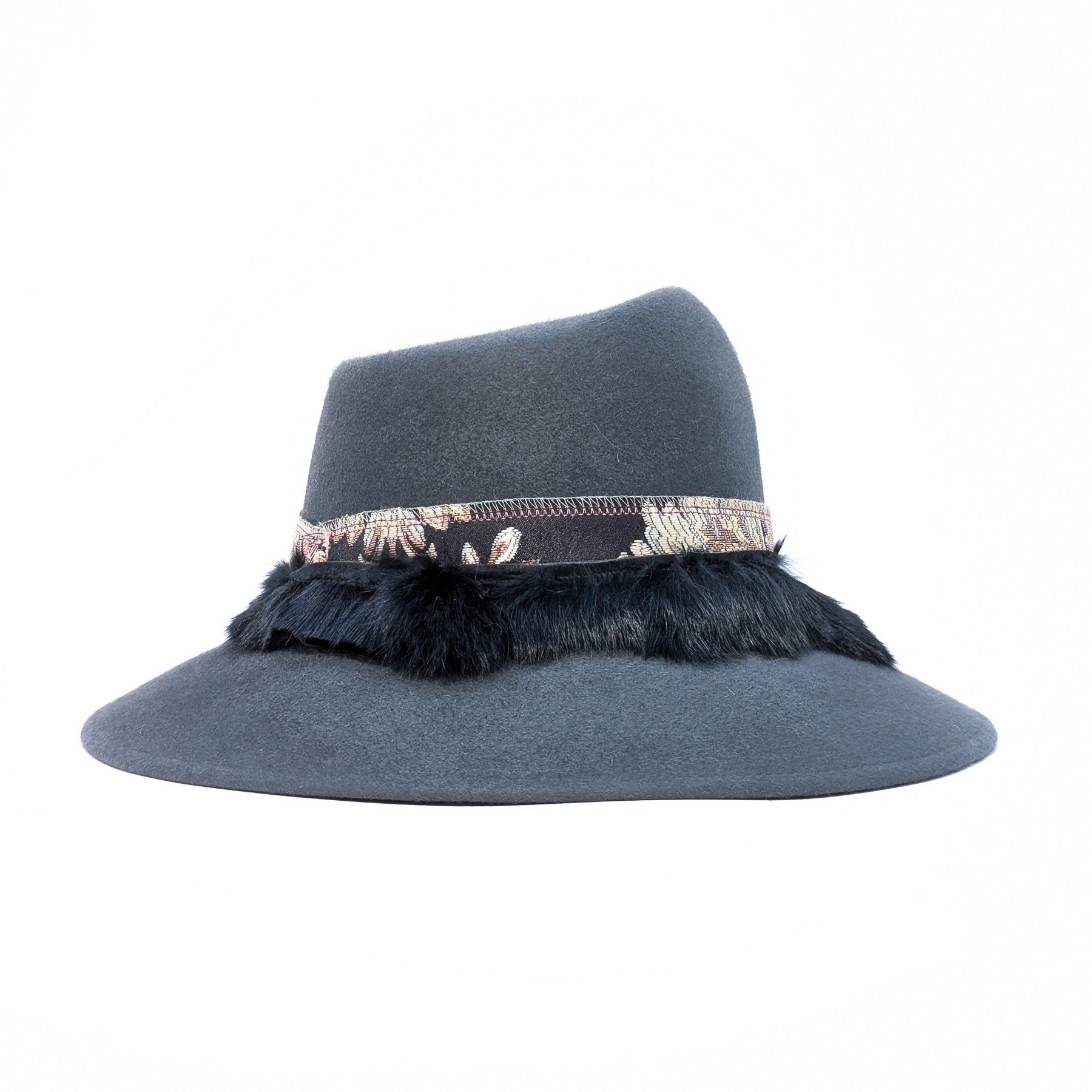 This long haired rabbit felt comes in steel blue, featuring a short brim, an asymmetrical crown, and a grosgrain sweatband. A floral embroidered band and a dark fur adorn the hat.